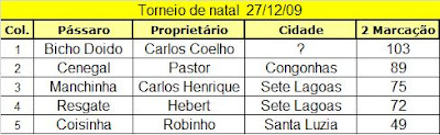 Tornado ( Geraldo) da show e finaliza com 183 cantos colocando de vez as asas no título ! Rabugento( Gilmar) fica em segundo lugar com 173 cantos e o Nelore ( Gustavo) em terceiro com 154 cantos. Na classificação geral o Boca Livre ( Jaime) mantém a ótima regularidade e segue como vice-líder após conquistar o quinto lugar nesta etapa com 146 cantos.NO PRÓXIMO DOMINGO DIA 27/12/09 ACONTECERÁ UM MINI-TORNEIO NO CLUBE BELO HORIZONTE. EM BREVE MAIORES INFORMAÇÕES, NÃO DEIXEM DE VISITAR O NOSSO SITE.